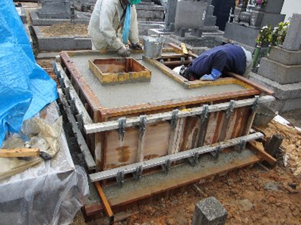 - 生コンを入れバイブレーターにてしっかりと生コンを絞めます